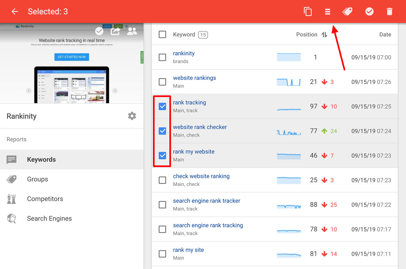 Please note that when you select keywords, groups, competitors or Search Engines, the navigation panel turns red to indicate the editing mode is on.