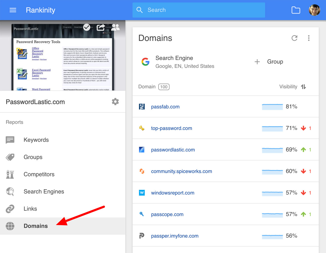 Having a database of links from search results for all keywords of the project, we can easily create a list of unique domains and sort them by visibility. This way, you get the top 100 competing domains with the best visibility for all keywords and for every keyword group.